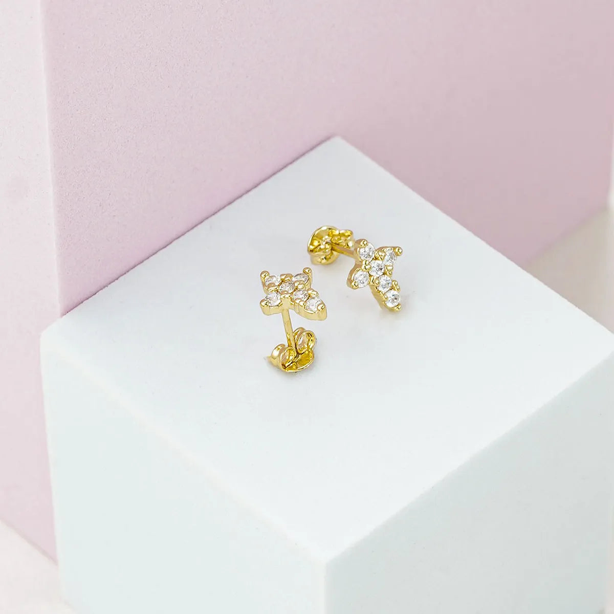 Aretes tipo stud. El frente presenta un grupo de circonitas blancas dispuestas en forma de estrellita/cruz con ligera curvatura, logrando un brillo uniforme y delicado.