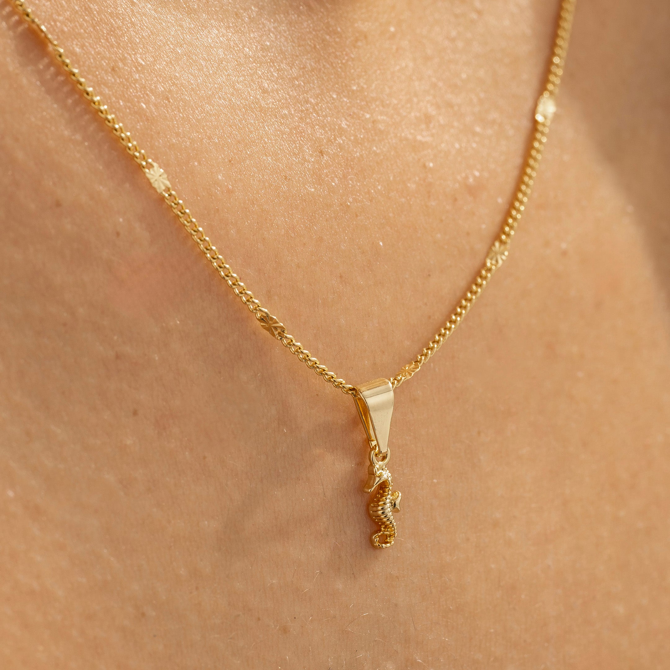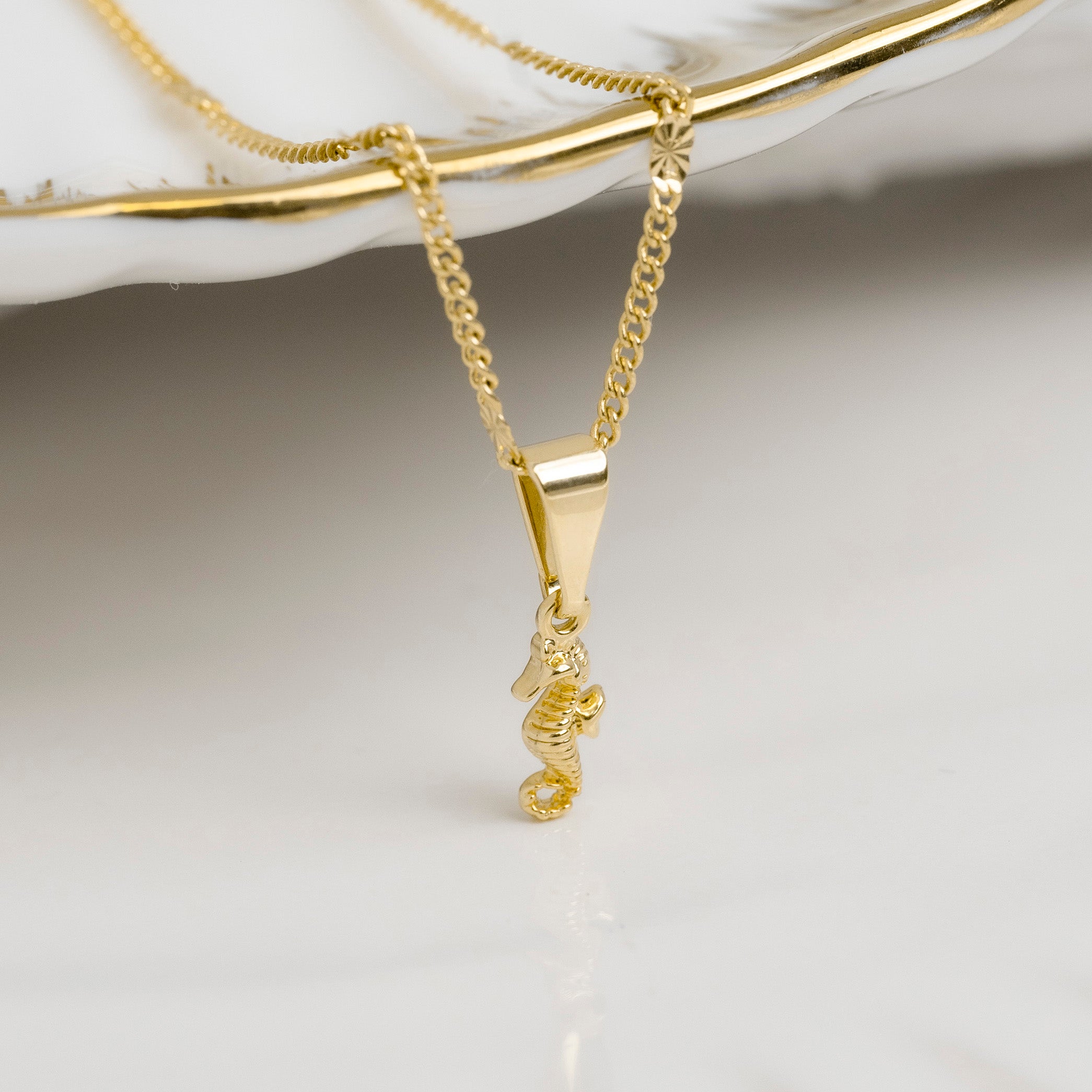 Mini dije con forma de caballito de mar, lleno de relieves que capturan la luz y le dan un brillo delicado. Un toque marino, tierno y elegante para usar solo o en capas.