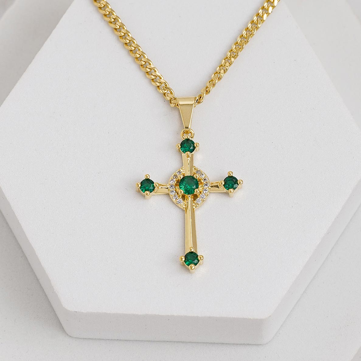 Este dije con forma de cruz resalta por su armonioso equilibrio y brillo intenso. En el centro, una piedra verde brillante rodeada de pequeños cristales transparentes crea un contraste lleno de vida y elegancia. Los brazos de la cruz se adornan con piedras del mismo tono, logrando una apariencia sofisticada y luminosa.