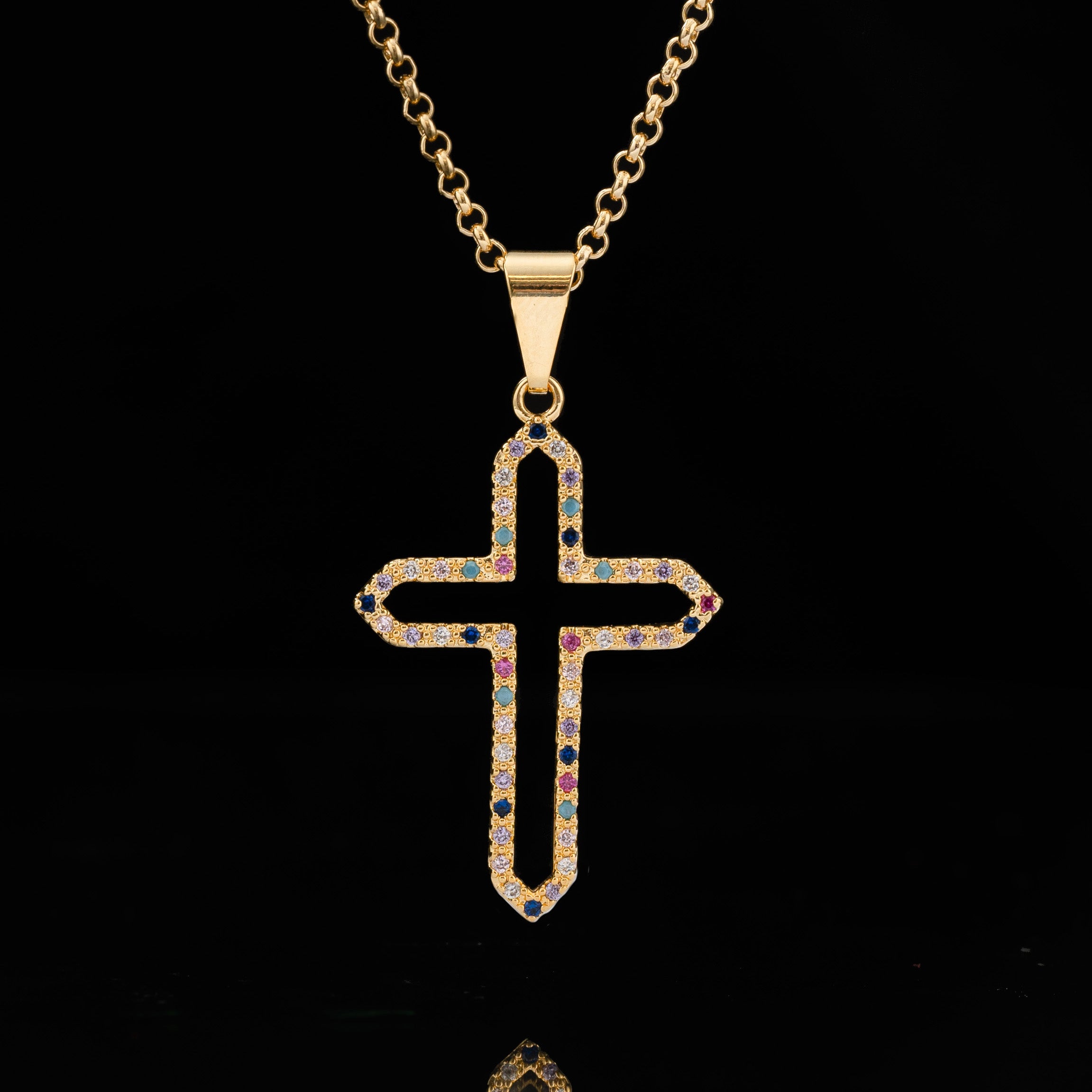 Cruz calada con perfil pavé multicolor: ligera, brillante y perfecta para dar un toque de color a cualquier cadena.