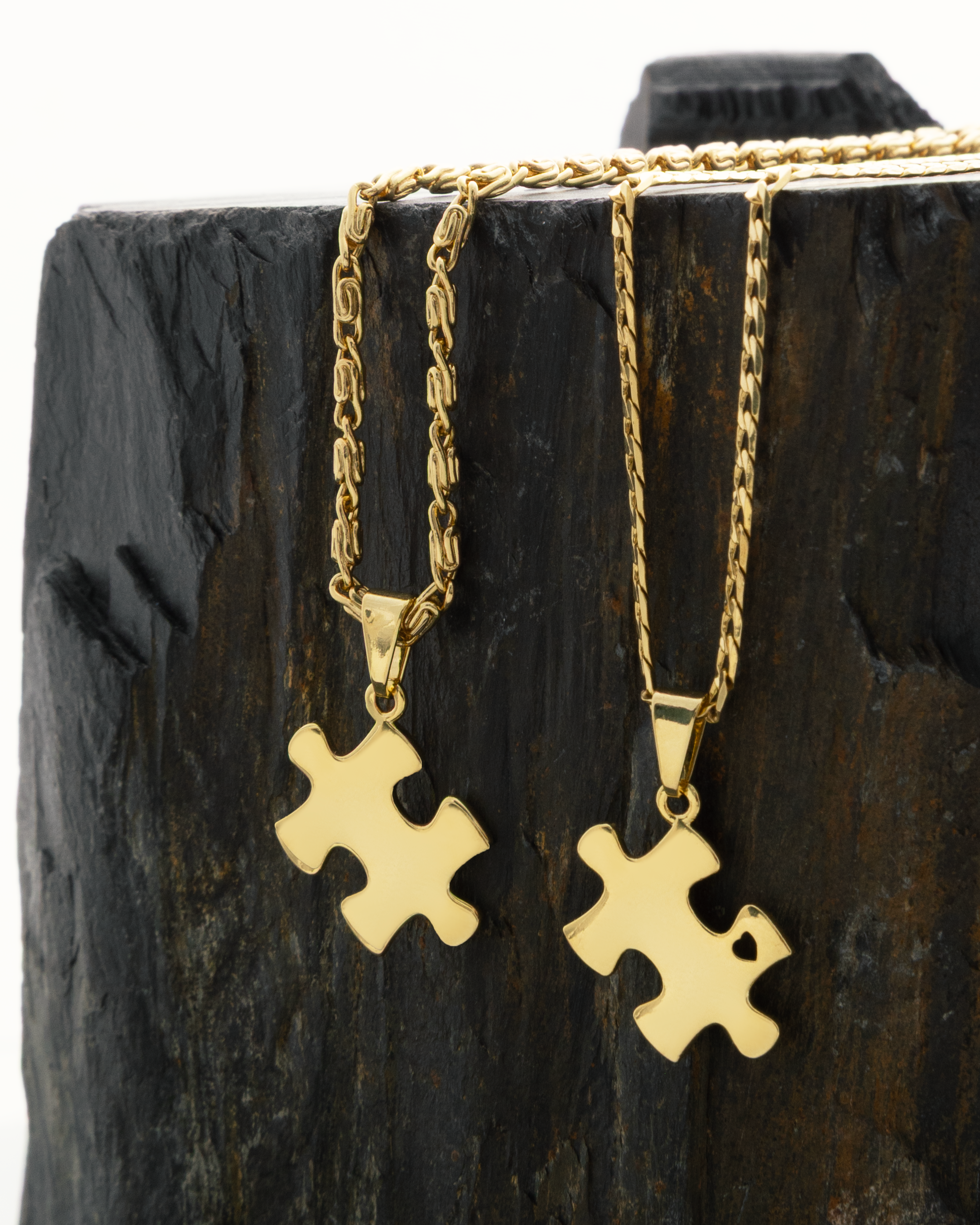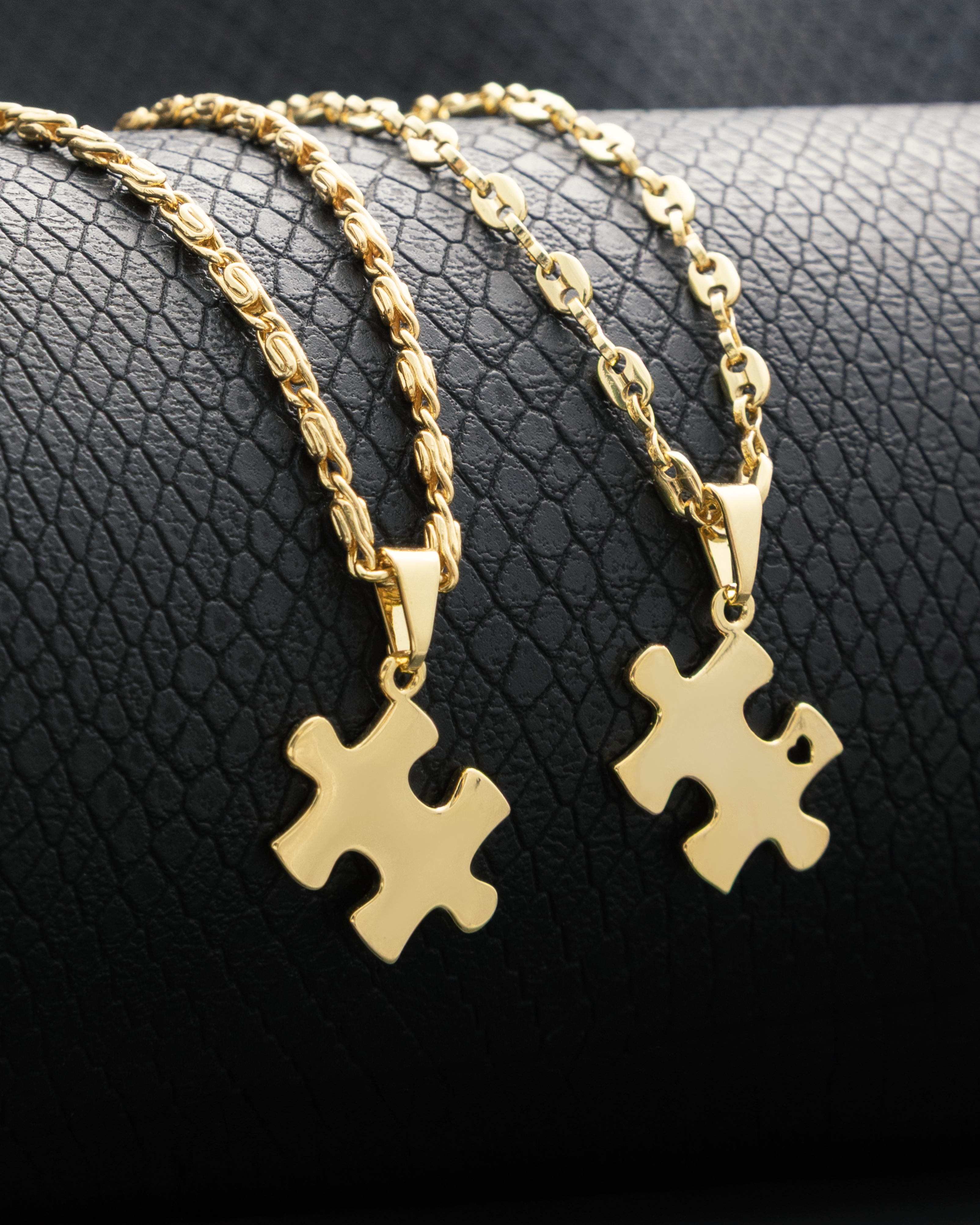 ¡Hermoso diseño! Este par de dijes en forma de piezas de rompecabezas es muy simbólico, perfecto para representar unión y complementariedad. Uno de los dijes incluye un pequeño corazón calado, detalle que realza su significado romántico y especial.